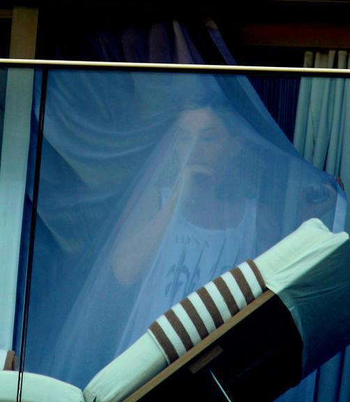 Madonna ainda timidamente aparecendo por trás da cortina do Hotel Fasano no Rio de Janeiro. Dizem que ela foi espiar a tal carta que a patrocinadora dos shows fez e imprimiu com 1 km de comprimento, com mensangens e fotos dos fãs (inclusive eu, autor do blog).